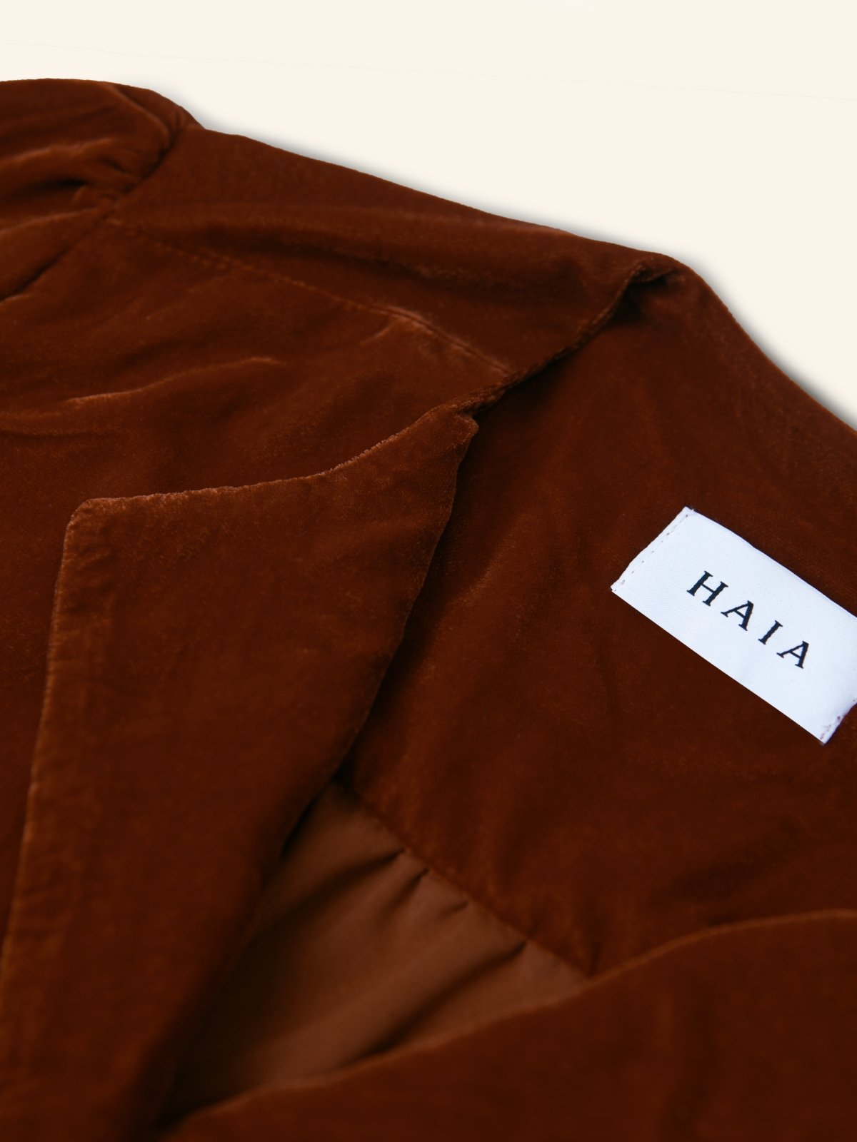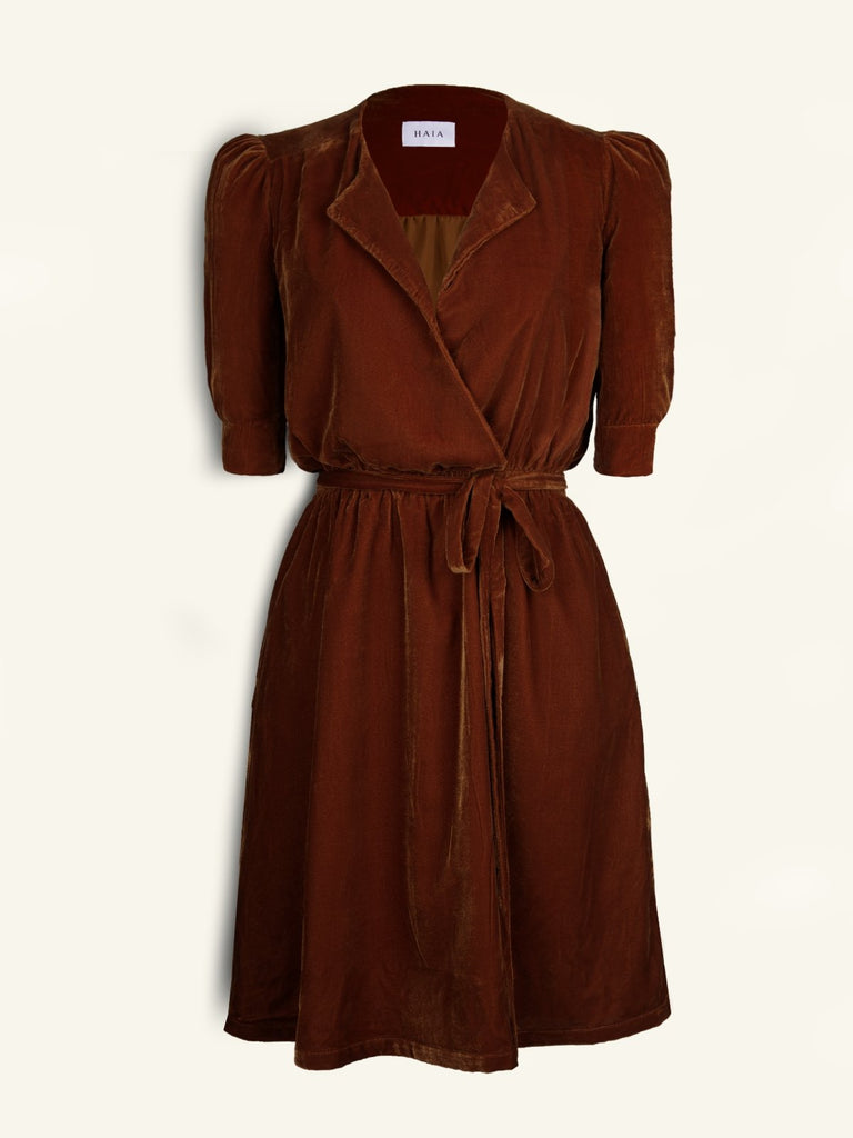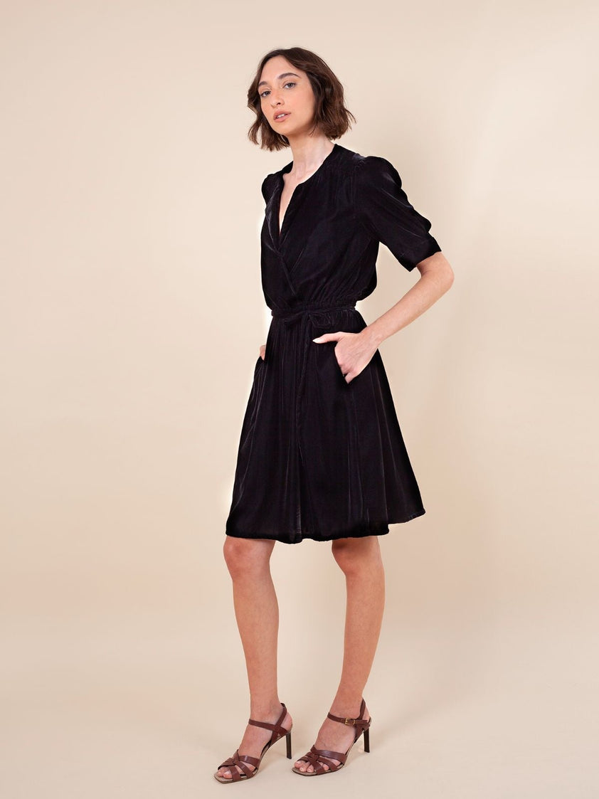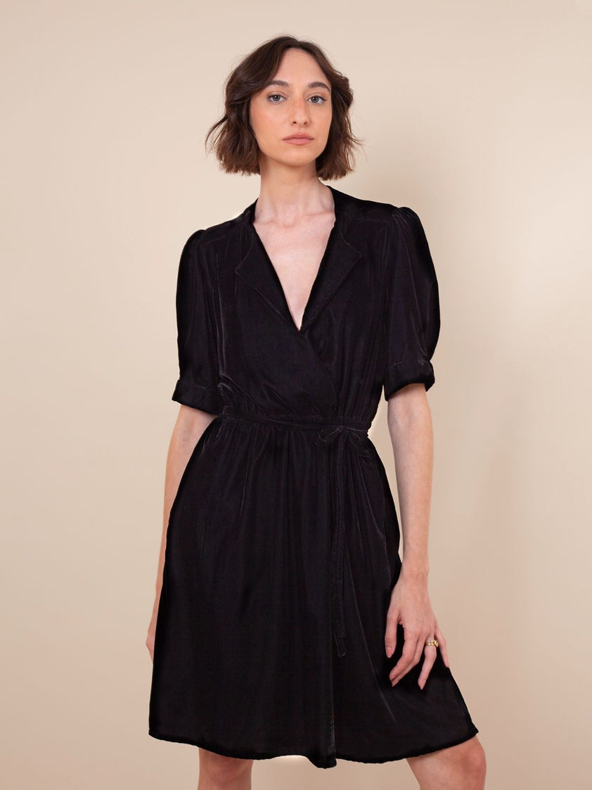A classic, flattering dress with a gathered waist and lapel detail, made out of silk velvet for the most luxurious and elegant feel.