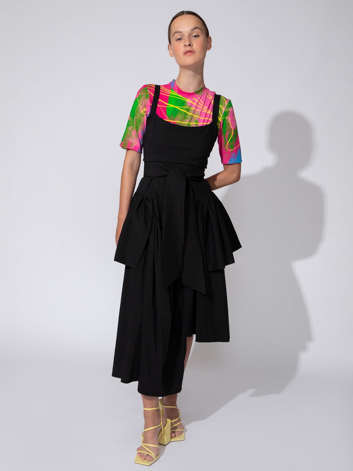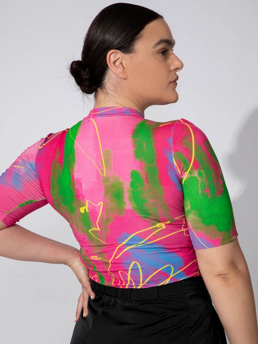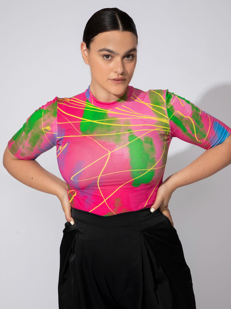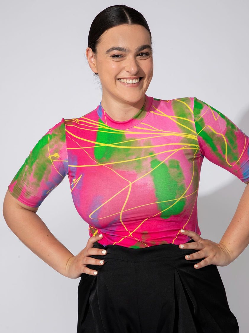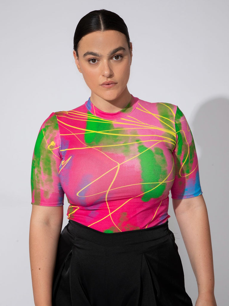 An extra-fitted T-shirt, flattering and light with a round neckline. The Perfect splash of color, with the original abstract print made by the designer Shahar Avnet.